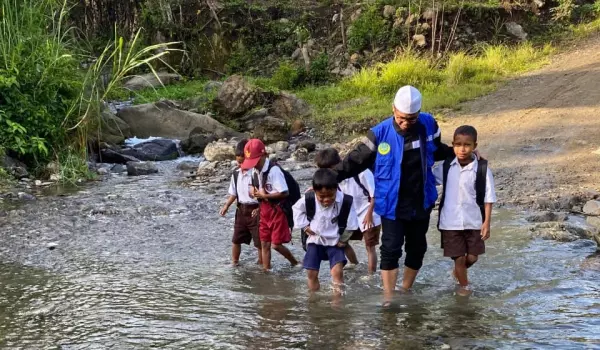LAZNAS Dewan Dakwah - Pagi hari di balik gunung dan rimbunnya pepohonan Ngoyo, langkah-langkah kaki kecil telah berderap, berhenti untuk menanti di depan kediaman Ustadz Aria, menunggunya untuk berangkat bersama ke sekolah.