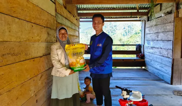 Namun, setelah lama saya bujuk, akhirnya ibu itu mau. Selesai bagi-bagi dan warga pulang membawa beras masing-masing, di tangga rumah, ia berkata: